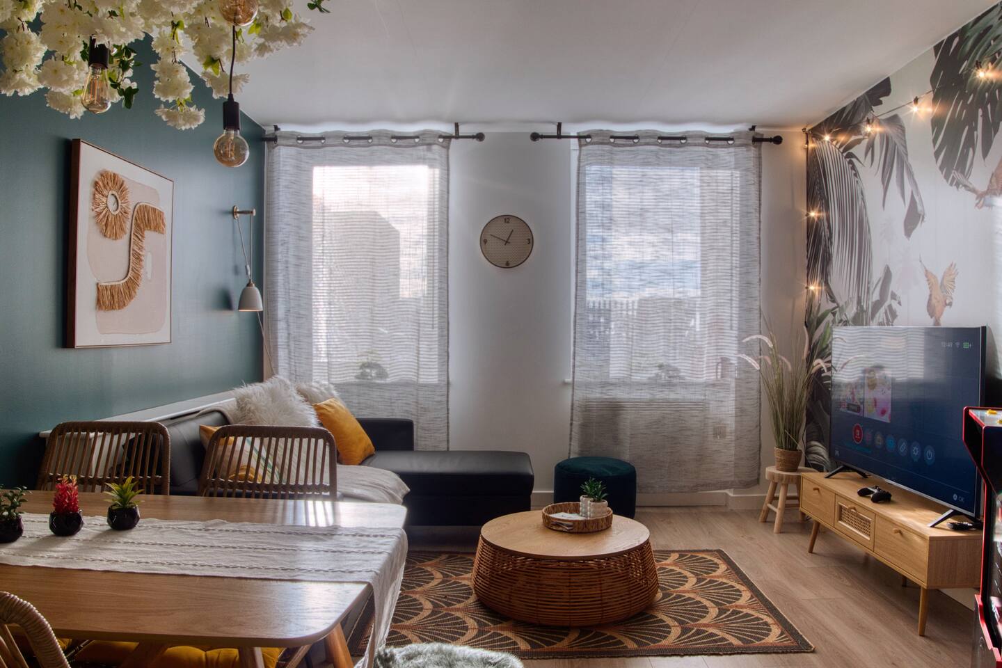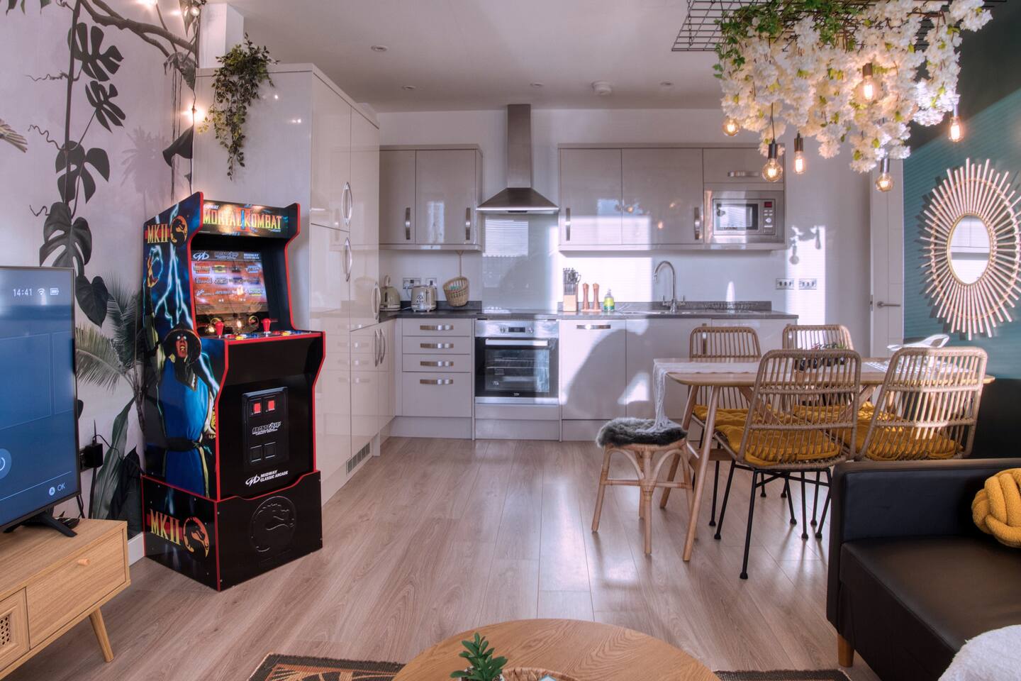 ✺ Perfect for professionals & leisure travellers ✺ Dedicated parking for 2 cars ✺ Self check-in ✺ Arcade Machine ✺ 55" 4k HDR TV, Netflix & Nintendo Switch Discover the perfect blend of convenience & tranquility at our designer flat in central Gloucester. Close to nearby business parks & hospitals. Short drive away from Cotswold. Our retreat offers tropical zen decor & luxurious amenities, including arcade machine, gaming room, parking, 2 high spec bathrooms & dedicated desk for your laptop.