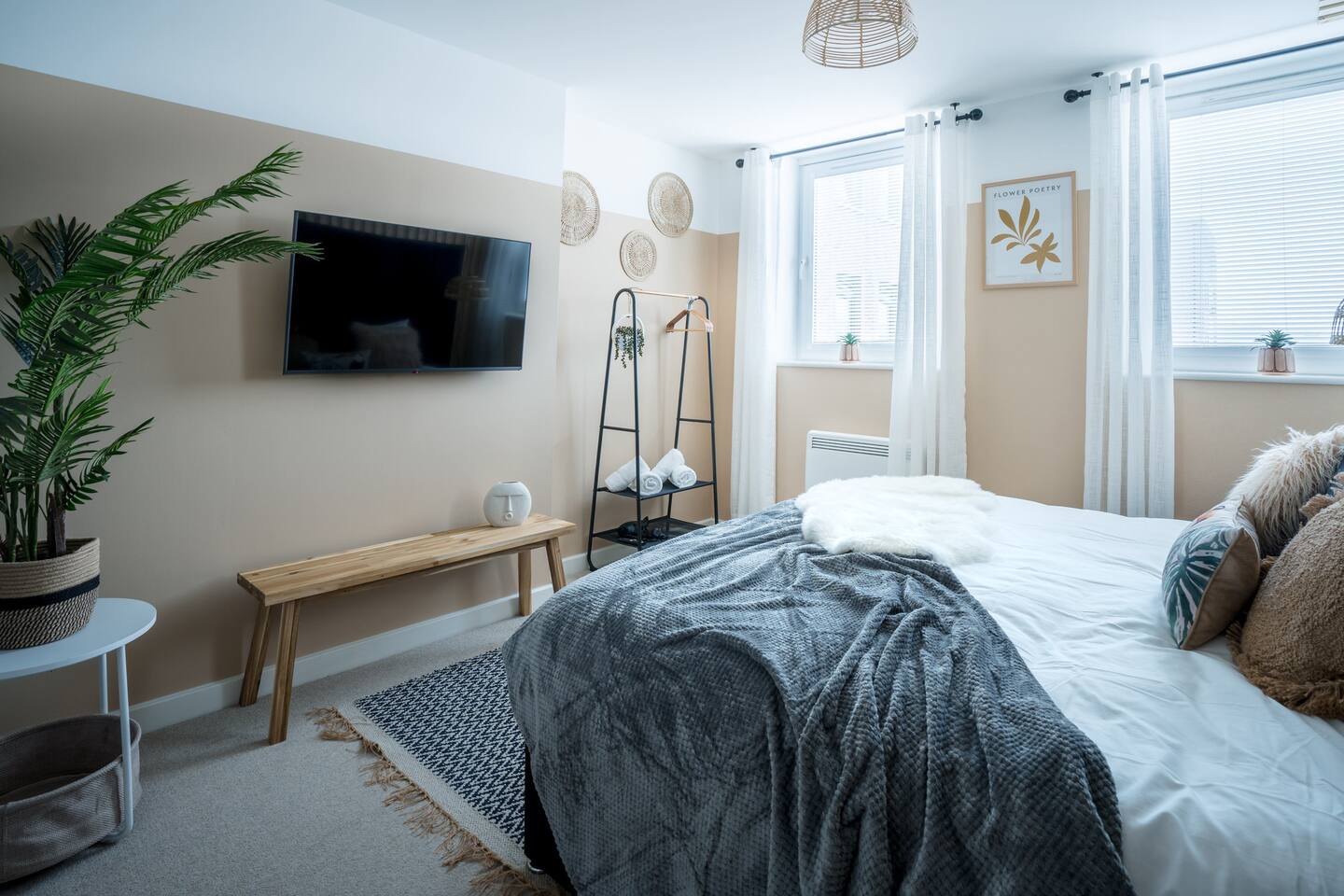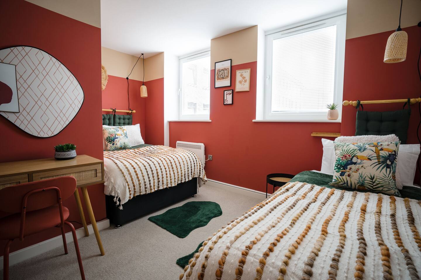 Welcome to our cozy, newly built ground floor apartment, designed with a fresh tropical ZEN luxury style. This inviting space offers two spacious bedrooms: the master bedroom features a super-sized king bed and a private bathroom, while the second bedroom has both a double and a single bed, along with a roomy family bathroom right next door. The living room is a comfy retreat with a double-seater single-sleeper sofa bed, a retro arcade machine for some fun, a 55" 4k HDR TV with Nintendo Switch for entertainment, and lovely ambient lighting for a relaxed atmosphere. Netflix is ready for you to use on the TV - just hit the "Netflix" button on your remote ;) Nintendo Switch has a legendary Mario Kart 8 installed. Kids (and the young at heart) will have a blast with the retro Mortal Kombat arcade machine. There is also a secondary 4k HDR 43" TV in the master bedroom :) Our kitchen is fully equipped with everything you need, including a coffee machine, dishwasher, microwave, washing machine, oven, and induction stove. There are two ample parking spaces available, perfect for large vehicles like trucks or vans. For your convenience, we offer 24/7 self-check-in using a key lockbox. This space is ideal for both leisure travellers and professionals, and there's even a dedicated workspace in the terracotta bedroom for private work sessions. Stay connected with super-fast Wi-Fi that covers the entire property. Our central Gloucester location provides easy access to transportation links, business parks, hospitals, and the beautiful Cotswold region. Come and enjoy your stay!