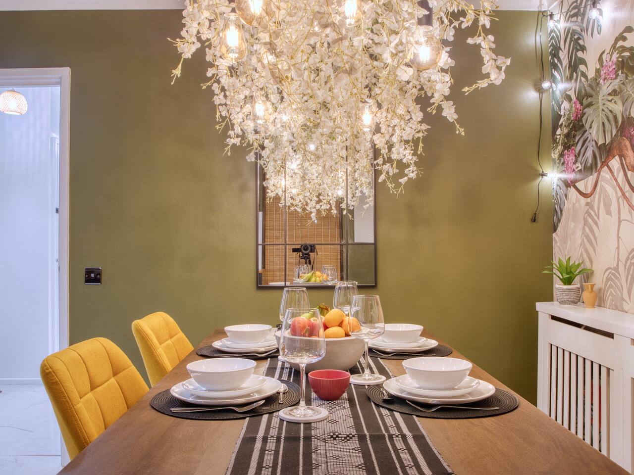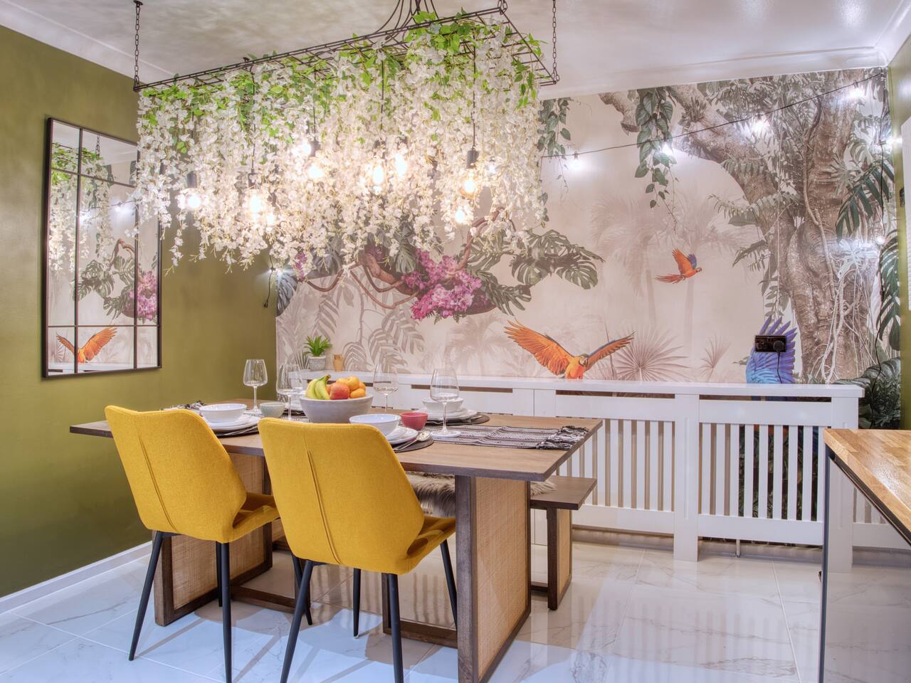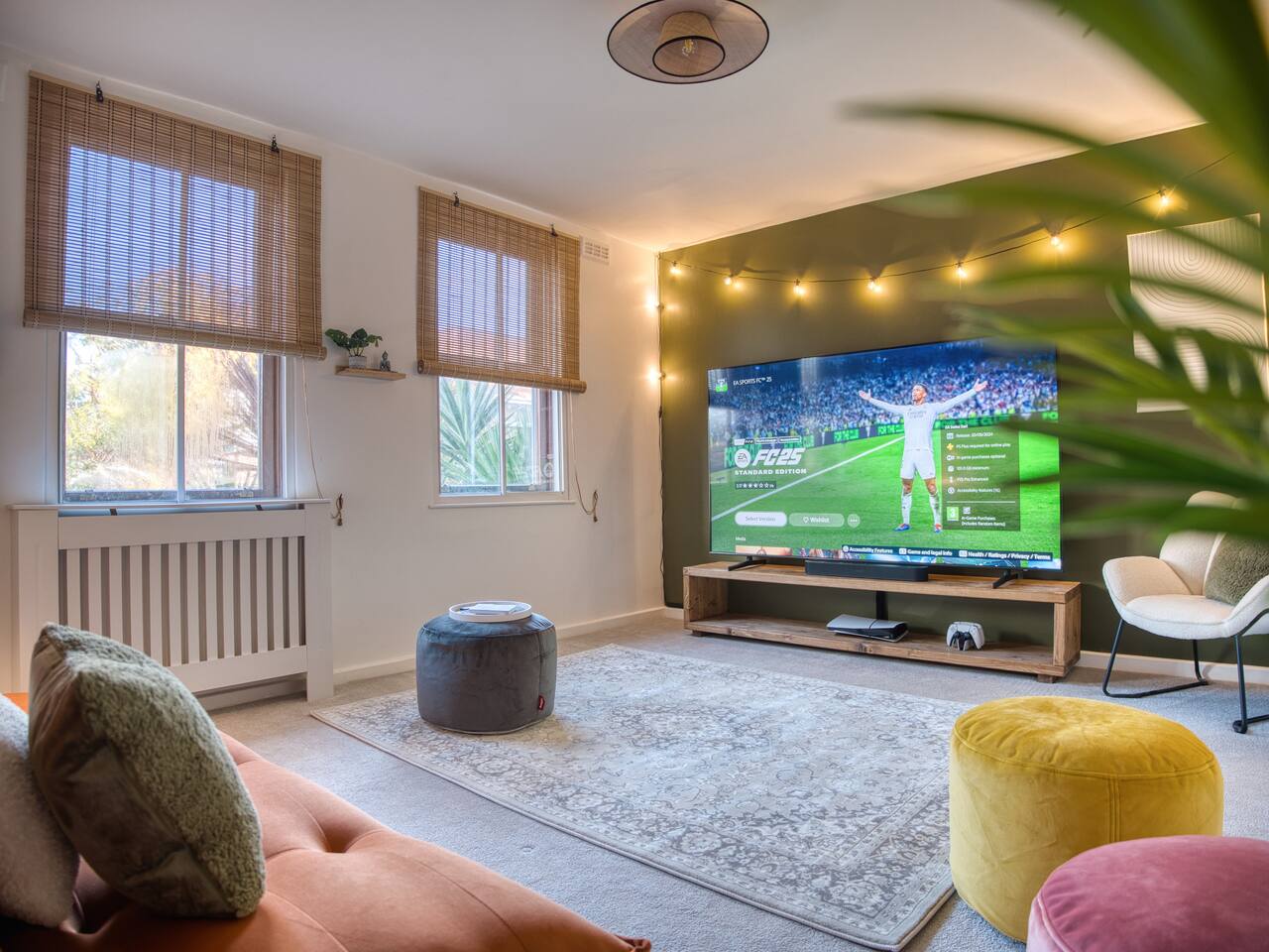 Welcome to our London retreat offering luxurious blend of tropical ZEN vibes with gaming contemporary style. Experience three uniquely designed bedrooms, each showcasing its own distinct style and captivating color palette. The "Mono Wood" bedroom offers a black-and-white tropical mural, two single beds, and an abundance of light and airiness. In the "Mustard" bedroom, you'll find a serene, rustic jungle-inspired ambiance with a double bed. The "Terracotta" bedroom combines boutique charm with a functional workspace and two single beds. The living room is a haven of relaxation, boasting a premium and unique orange triple-seater sofa bed, three "Fatboy" velvet stools, an 85" 4k HDR TV with Playstation 5, Netflix 4k subscription and ambient lighting that sets the perfect mood. PS5 has tons of legendary games installed, including EAFC2025, Mortal Kombat 1, Hot Wheels Unleashed 2, Little Big Planet 3, SIMS 4, Soulcalibur 6 and more. Our brand new kitchen is fully equipped with everything you need, including a Dolce Gusto pods coffee machine, dishwasher, microwave, premium SMEG appliances, oven and washing machine. You will have a jar full of tea, sugar & instant coffee, 3x Dolce Gusto coffee pods, 3x dishwasher tablets, 3x washing tablets, 1x kitchen towel, extra bin liners, 1x sponge, 8x toilet rolls, washing up liquid, hand gel, shower gel, shampoo & conditioner in every bathroom. After a busy day exploring London or working, unwind in the private back garden's hot tub—a perfect spot to relax and recharge. With 24/7 self-check-in via a key lockbox, your arrival is smooth and hassle-free. Whether you're a leisure traveler, family, single professional, or group of contractors, our high-speed Wi-Fi (powered by the Netgear Orbi system) ensures seamless connectivity throughout the property. Located in the heart of London, a brisk walk from Fulham Broadway tube station, you're perfectly positioned to enjoy all that London has to offer. Explore nearby parks, trendy coffee shops, delicious restaurants (including vegan-friendly options), and top London attractions with ease—making this the perfect base for your London adventure!