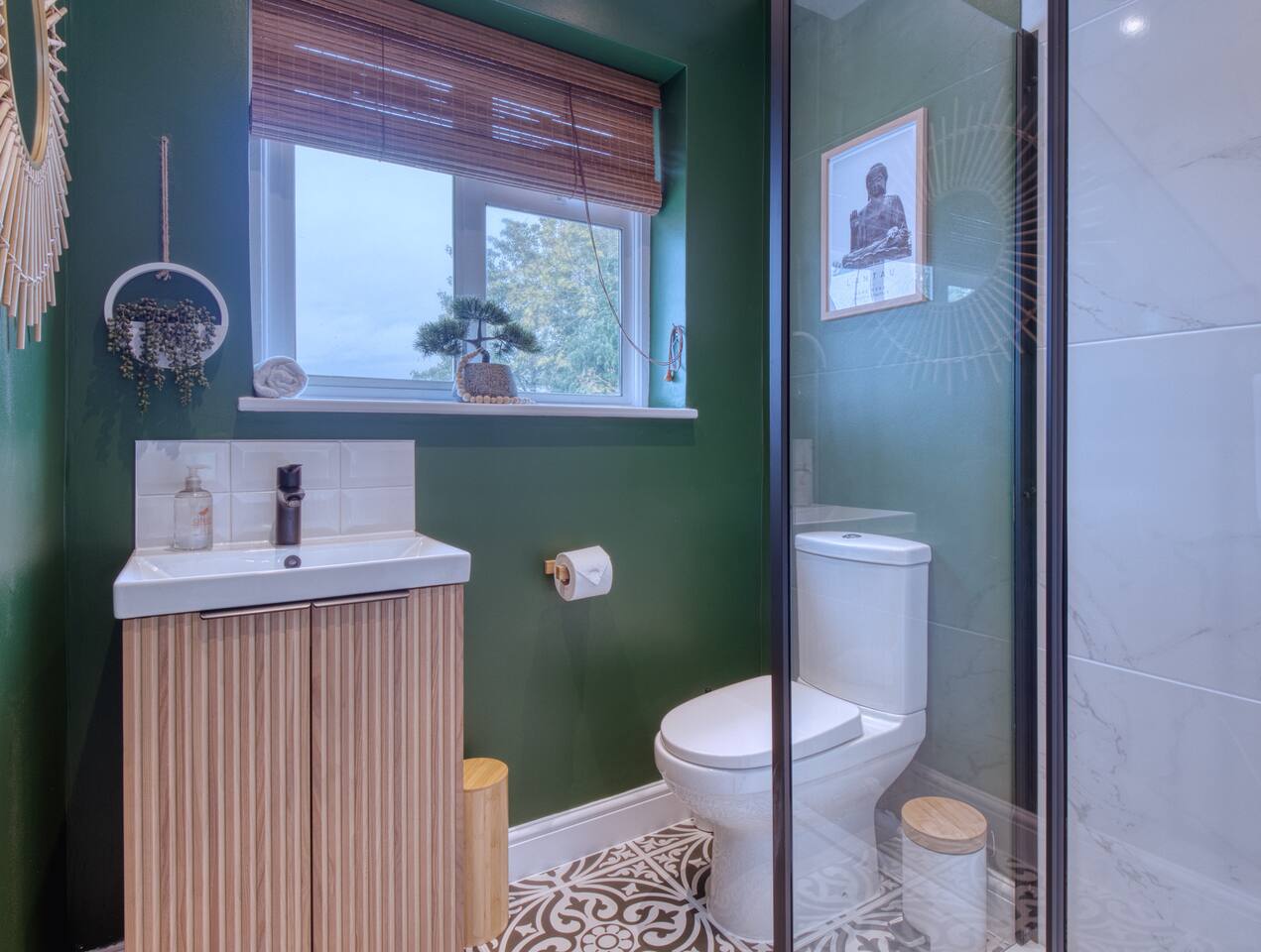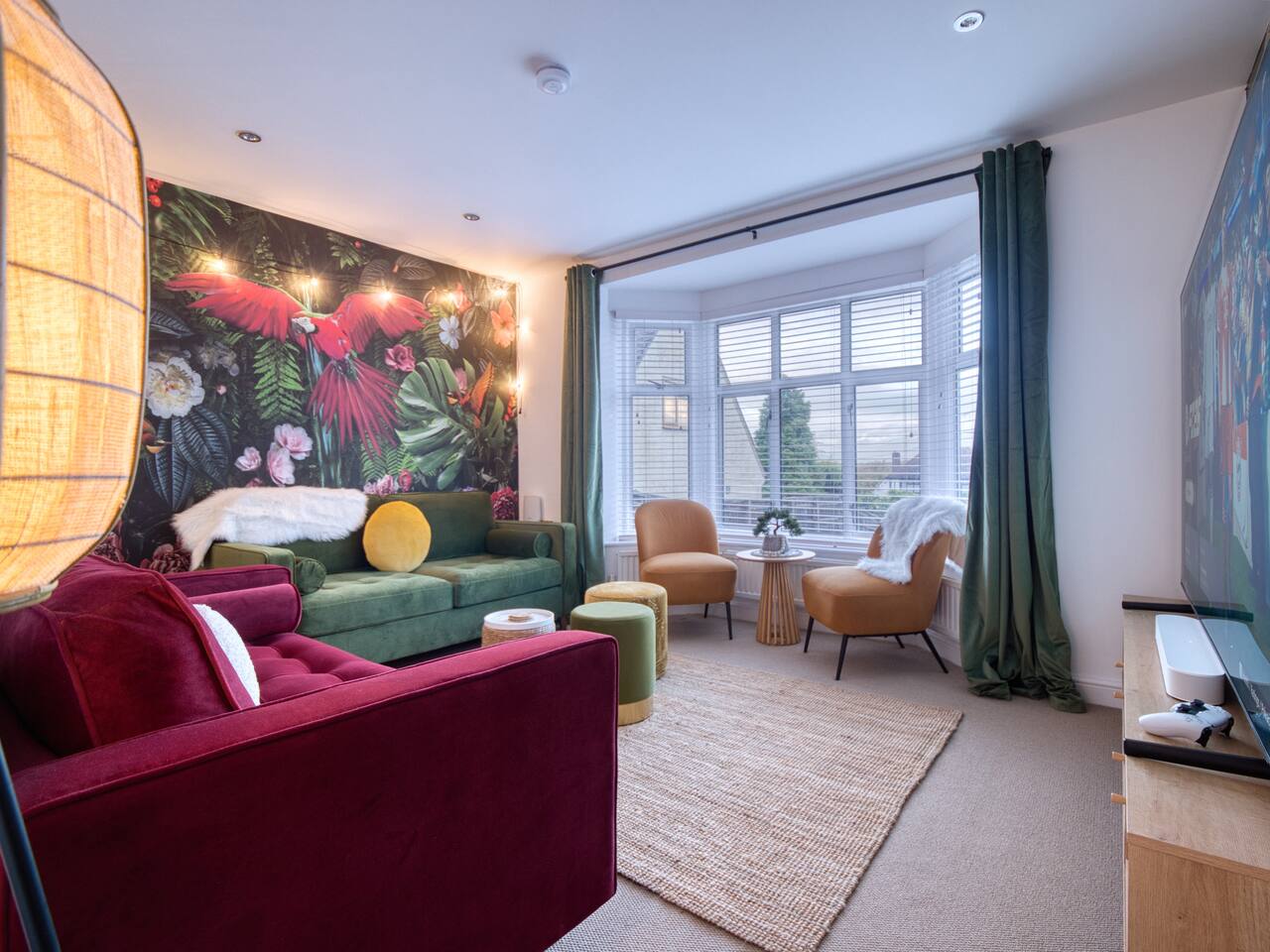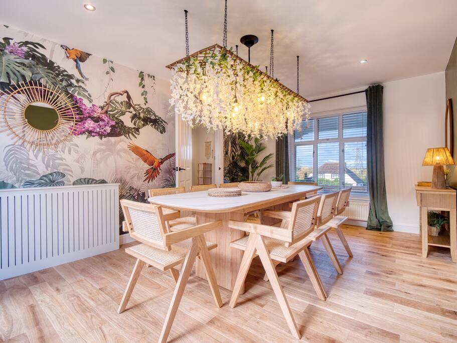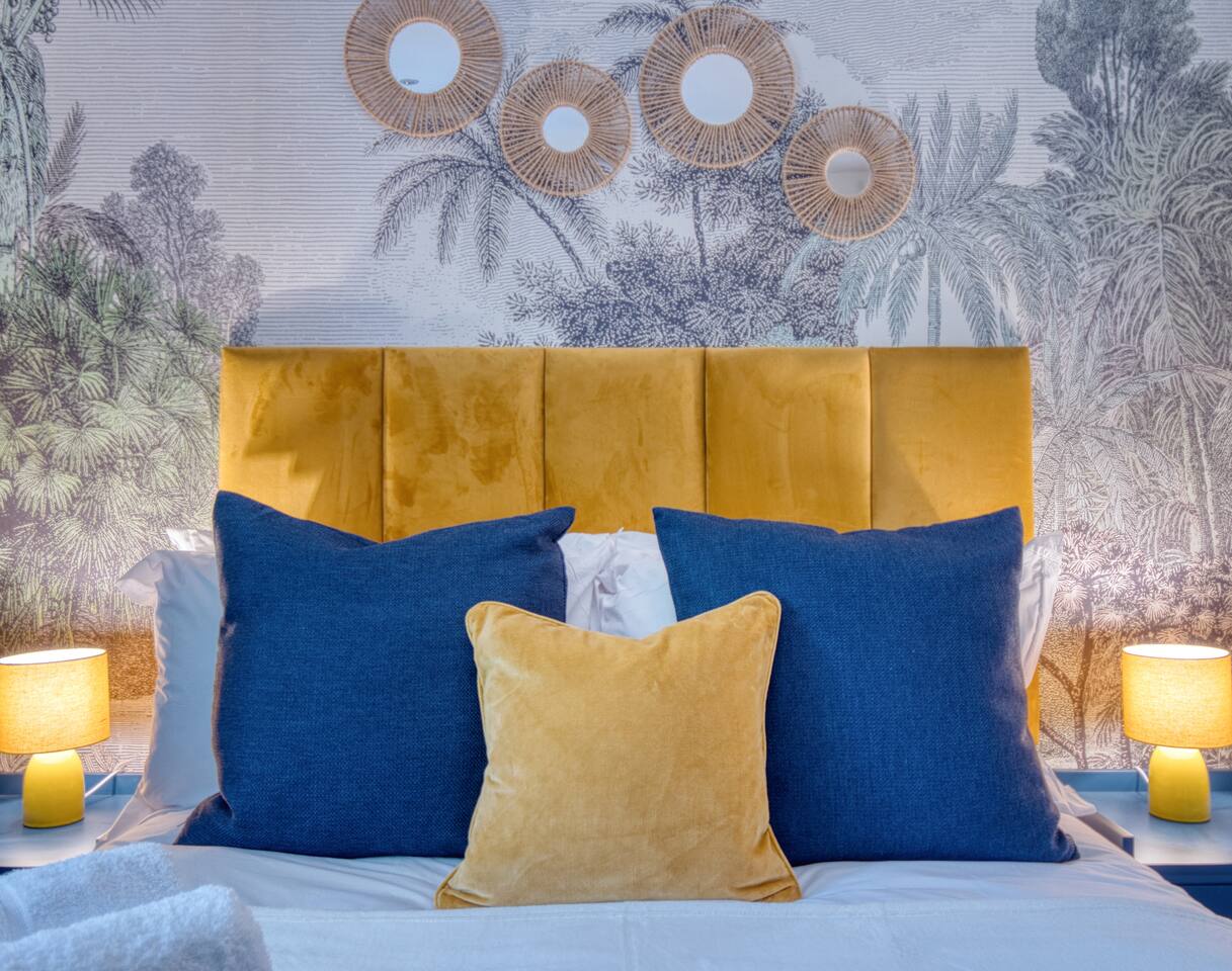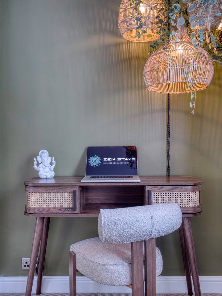Welcome to our Oxford retreat – a high end 4-bed detached home combining modern comfort with calming ZEN energy. Each bedroom is uniquely styled: the “Jungle” master bedroom with a super king bed and workspace, the “Mono Wood” room with a striking wood feature and king-size bed, the earthy twin bed “Terracotta” room, and the cosy “Mustard” room with a double bed and soft blue accents. The living room offers vibrant rainforest décor, red and green velvet sofas, orange armchairs, and an 85” 4K TV with PlayStation 5, Sonos Beam and ambient lighting – the perfect setup for relaxed evenings. A stylish dining room leads into a ZEN gaming space with a sofa, pool table, darts board, arcade machine and Sonos speaker – offering plenty of space for comfortable living and group stays. The kitchen is fully equipped with premium SMEG appliances, a Dolce Gusto coffee machine, dishwasher, washing machine and basic essentials provided for a seamless stay. Outside, enjoy the huge private garden with a hot tub under a gazebo, Ninja BBQ set, dining area, and swing set – perfect for relaxing or entertaining. (Please note: while mostly secure, the low front wall may be jumpable for adventurous dogs.) The front driveway offers secure parking for 6+ cars behind a remote-controlled electric gate. Self-check-in via a lockbox and high-speed Wi-Fi powered by Netgear Orbi make your stay effortless. Set in Oxford’s desirable OX2 postcode, just 10 minutes drove from the city centre, this home offers the ideal mix of luxury, space and tranquillity.