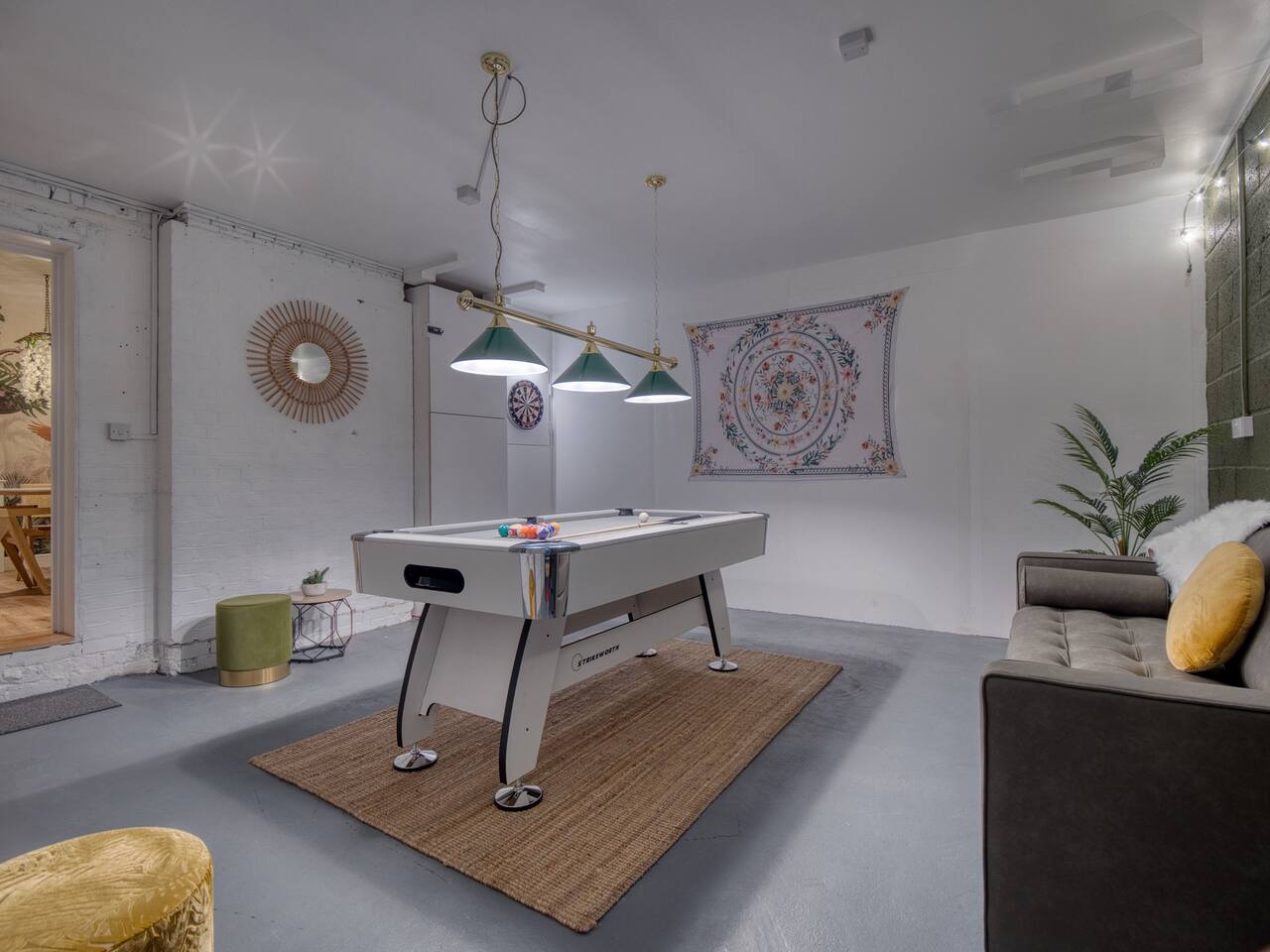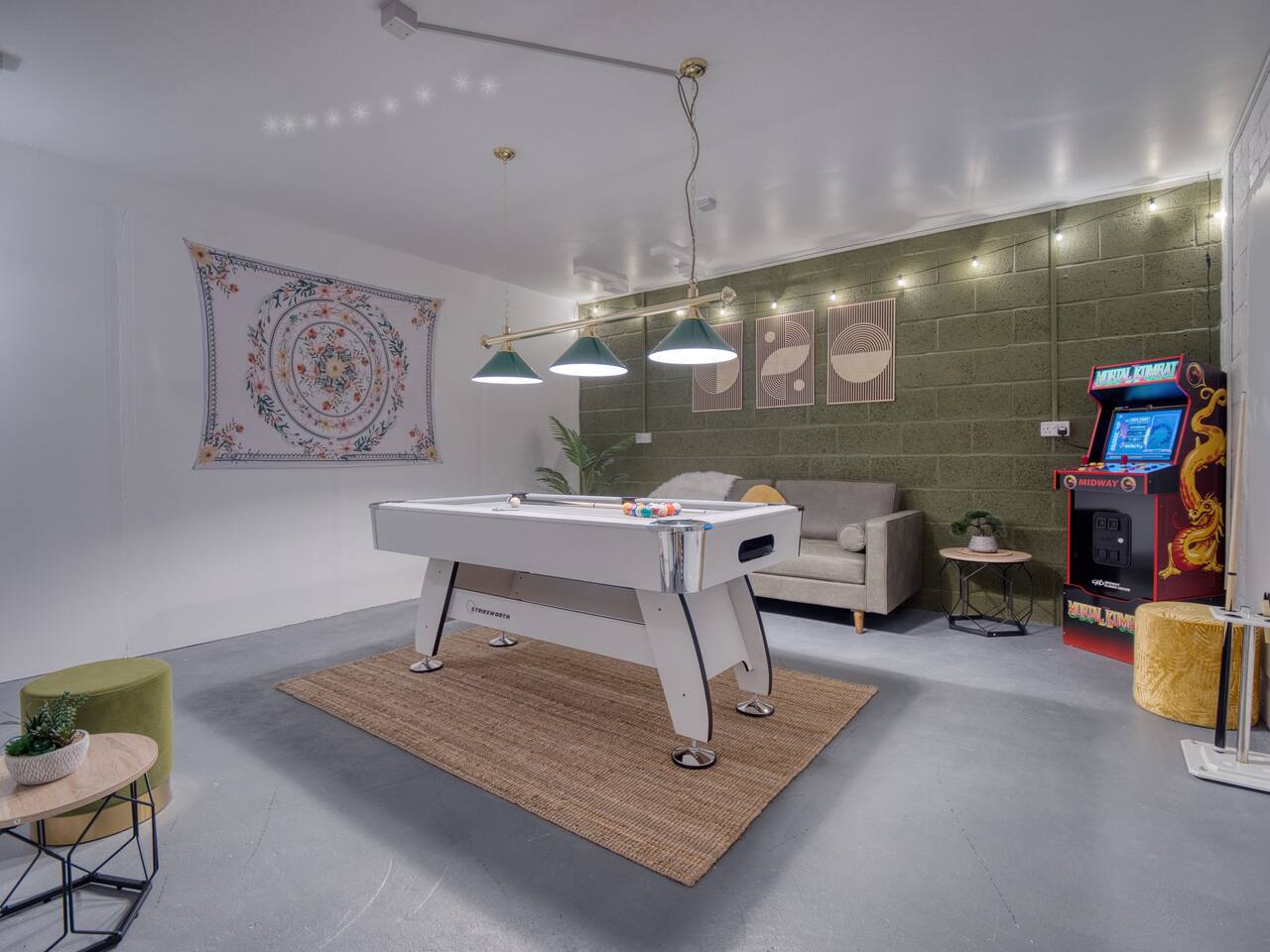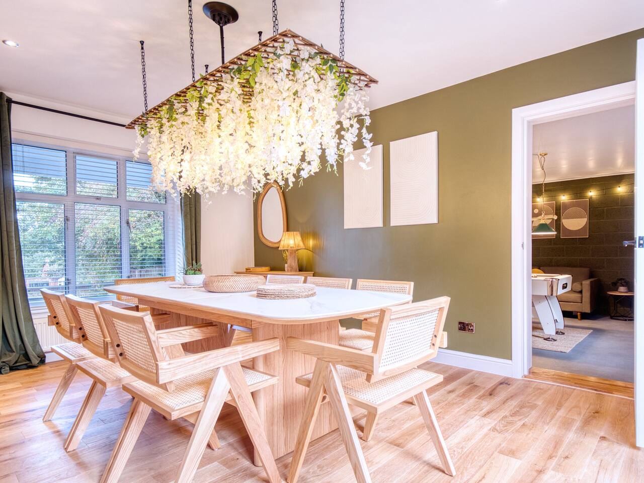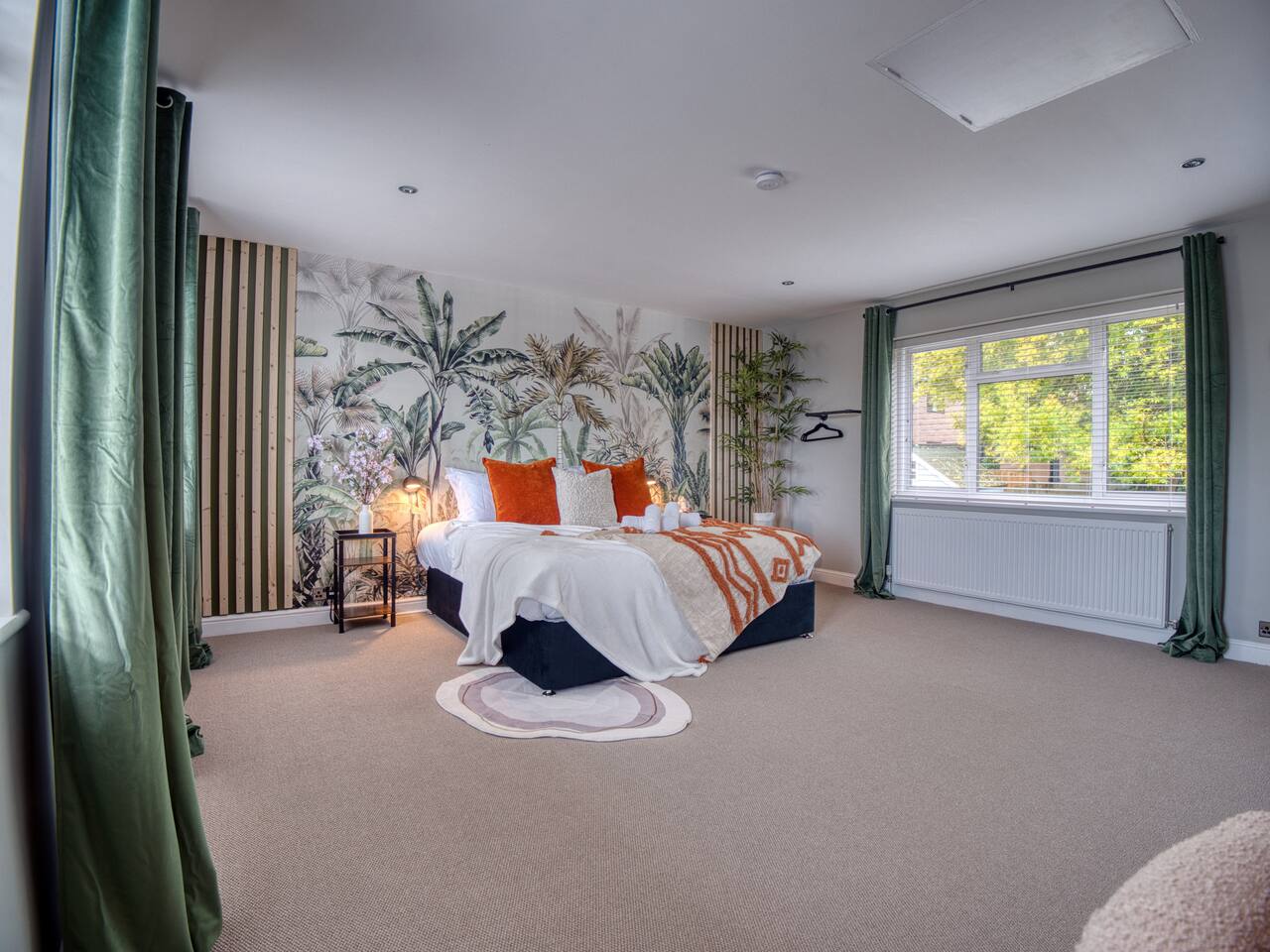 Welcome to our Oxford retreat – a high end 4-bed detached home combining modern comfort with calming ZEN energy. Each bedroom is uniquely styled: the “Jungle” master bedroom with a super king bed and workspace, the “Mono Wood” room with a striking wood feature and king-size bed, the earthy twin bed “Terracotta” room, and the cosy “Mustard” room with a double bed and soft blue accents. The living room offers vibrant rainforest décor, red and green velvet sofas, orange armchairs, and an 85” 4K TV with PlayStation 5, Sonos Beam and ambient lighting – the perfect setup for relaxed evenings. A stylish dining room leads into a ZEN gaming space with a sofa, pool table, darts board, arcade machine and Sonos speaker – offering plenty of space for comfortable living and group stays. The kitchen is fully equipped with premium SMEG appliances, a Dolce Gusto coffee machine, dishwasher, washing machine and basic essentials provided for a seamless stay. Outside, enjoy the huge private garden with a hot tub under a gazebo, Ninja BBQ set, dining area, and swing set – perfect for relaxing or entertaining. (Please note: while mostly secure, the low front wall may be jumpable for adventurous dogs.) The front driveway offers secure parking for 6+ cars behind a remote-controlled electric gate. Self-check-in via a lockbox and high-speed Wi-Fi powered by Netgear Orbi make your stay effortless. Set in Oxford’s desirable OX2 postcode, just 10 minutes drove from the city centre, this home offers the ideal mix of luxury, space and tranquillity.