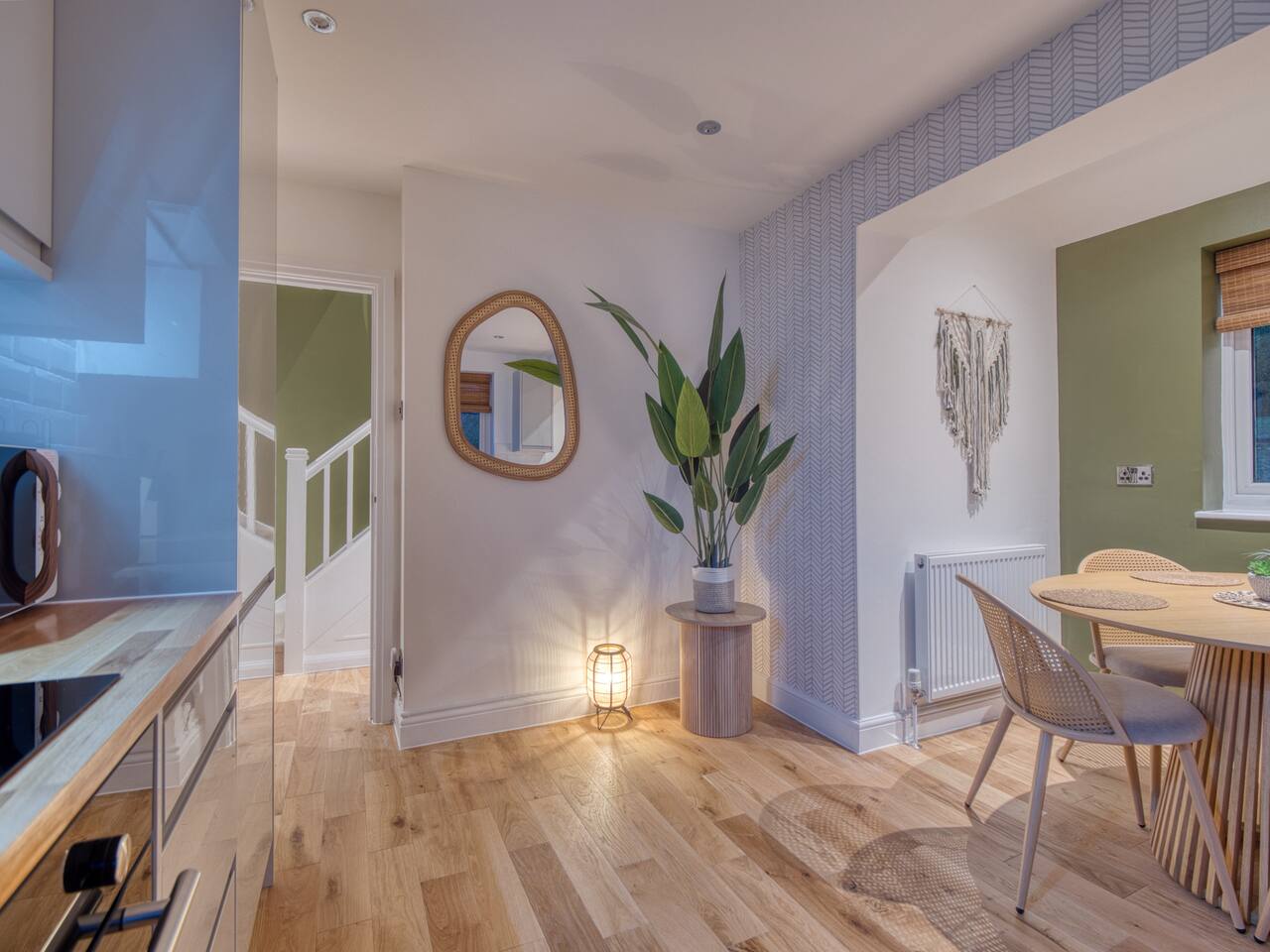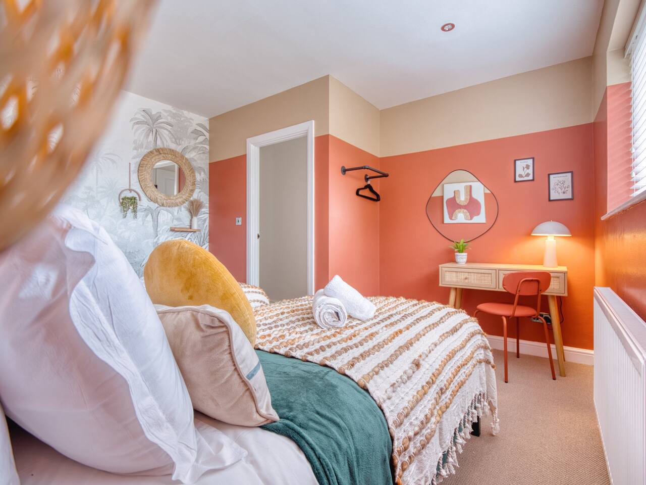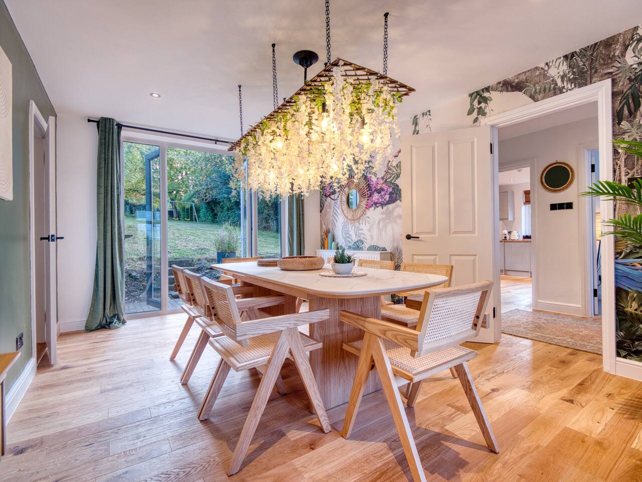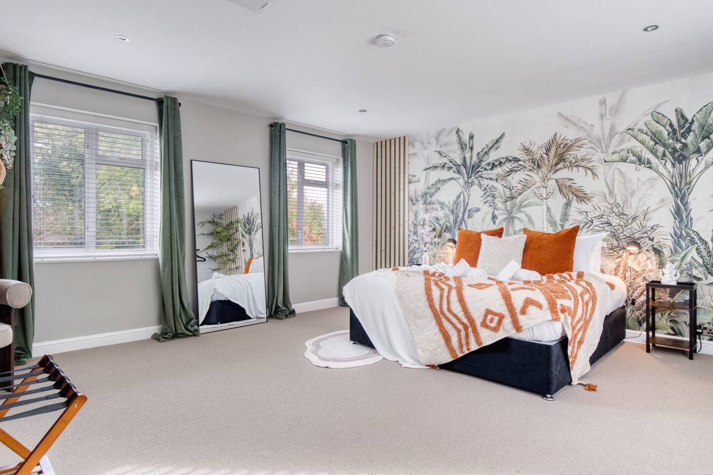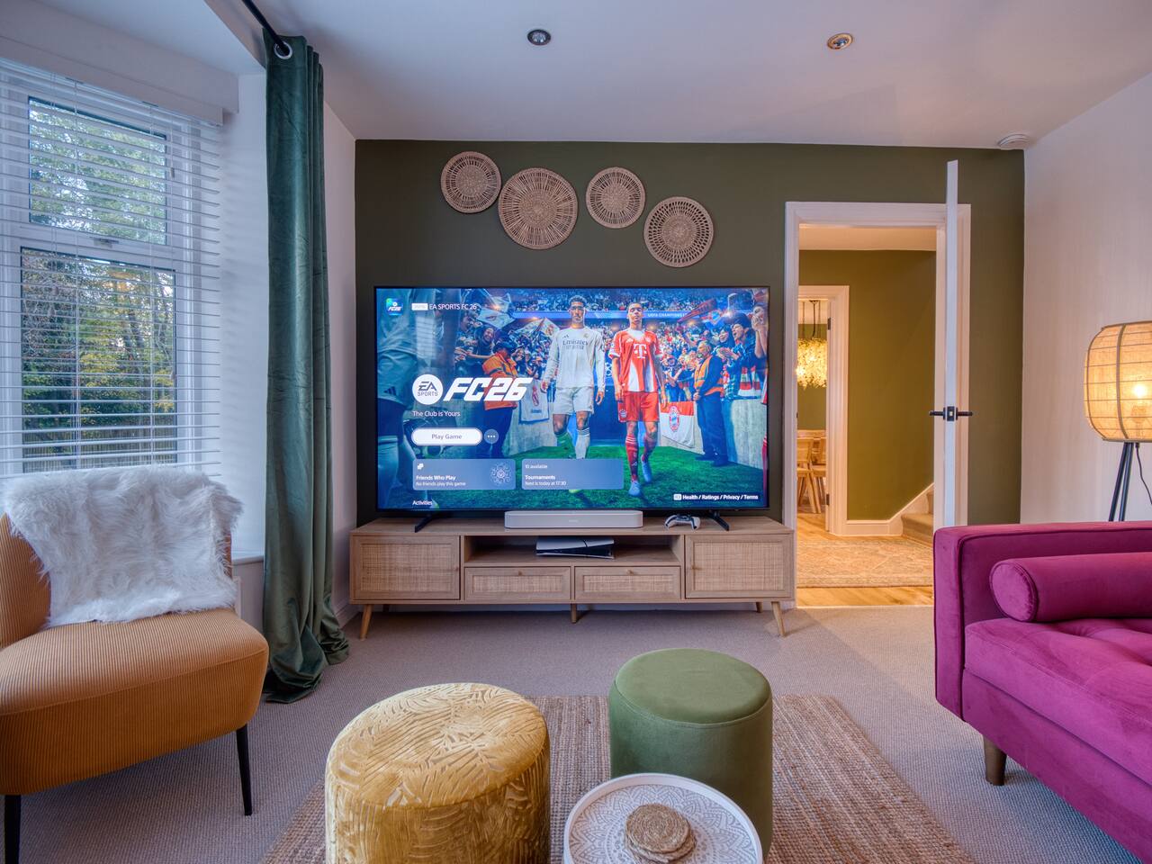 Welcome to our Oxford retreat – a high end 4-bed detached home combining modern comfort with calming ZEN energy. Each bedroom is uniquely styled: the “Jungle” master bedroom with a super king bed and workspace, the “Mono Wood” room with a striking wood feature and king-size bed, the earthy twin bed “Terracotta” room, and the cosy “Mustard” room with a double bed and soft blue accents. The living room offers vibrant rainforest décor, red and green velvet sofas, orange armchairs, and an 85” 4K TV with PlayStation 5, Sonos Beam and ambient lighting – the perfect setup for relaxed evenings. A stylish dining room leads into a ZEN gaming space with a sofa, pool table, darts board, arcade machine and Sonos speaker – offering plenty of space for comfortable living and group stays. The kitchen is fully equipped with premium SMEG appliances, a Dolce Gusto coffee machine, dishwasher, washing machine and basic essentials provided for a seamless stay. Outside, enjoy the huge private garden with a hot tub under a gazebo, Ninja BBQ set, dining area, and swing set – perfect for relaxing or entertaining. (Please note: while mostly secure, the low front wall may be jumpable for adventurous dogs.) The front driveway offers secure parking for 6+ cars behind a remote-controlled electric gate. Self-check-in via a lockbox and high-speed Wi-Fi powered by Netgear Orbi make your stay effortless. Set in Oxford’s desirable OX2 postcode, just 10 minutes drove from the city centre, this home offers the ideal mix of luxury, space and tranquillity.