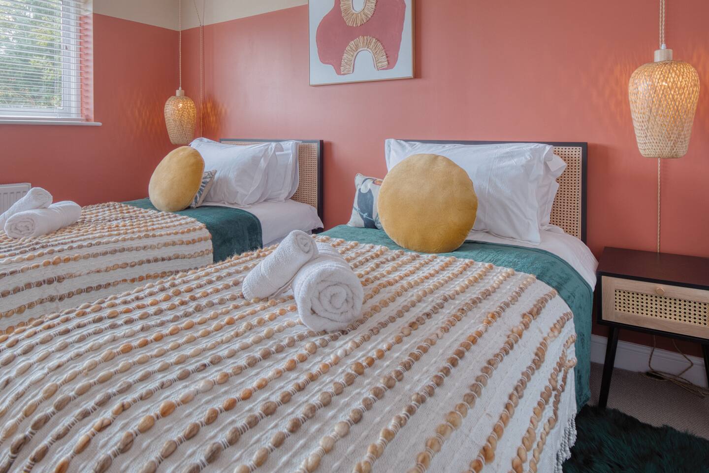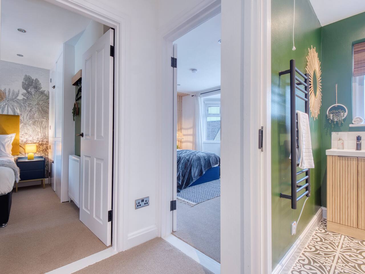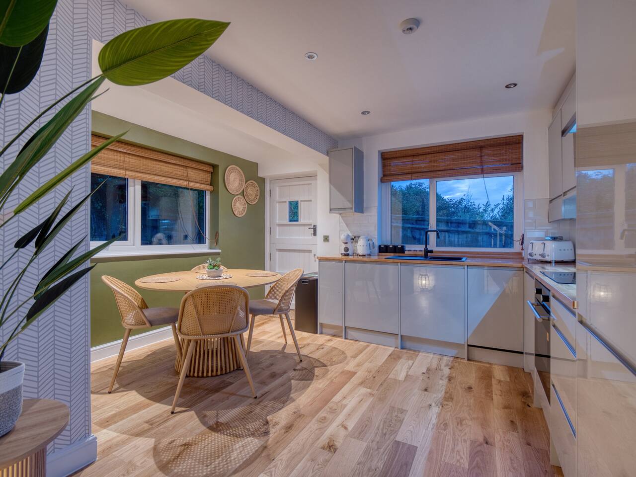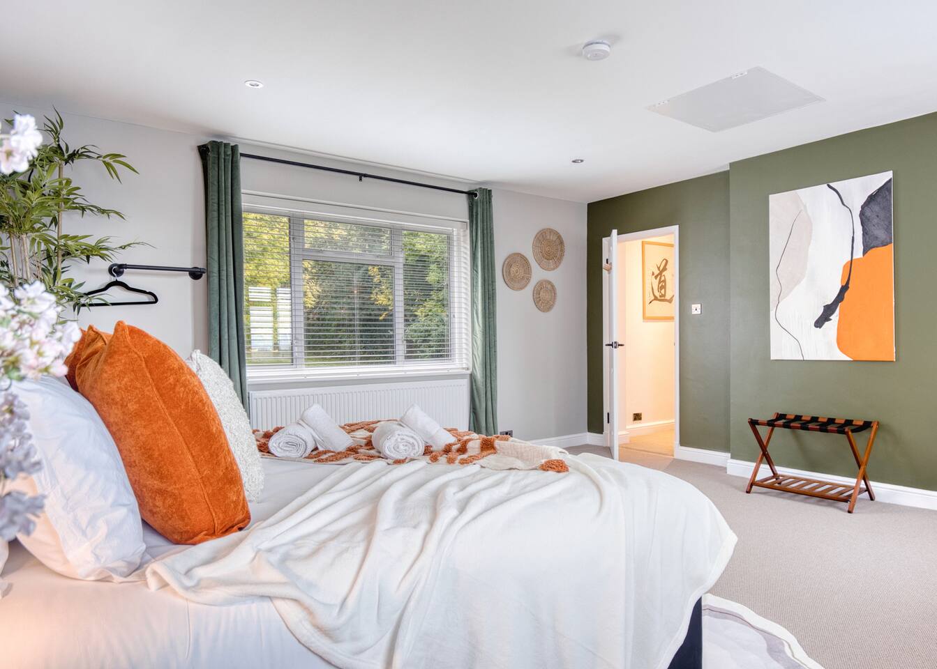 Welcome to our Oxford retreat – a high end 4-bed detached home combining modern comfort with calming ZEN energy. Each bedroom is uniquely styled: the “Jungle” master bedroom with a super king bed and workspace, the “Mono Wood” room with a striking wood feature and king-size bed, the earthy twin bed “Terracotta” room, and the cosy “Mustard” room with a double bed and soft blue accents. The living room offers vibrant rainforest décor, red and green velvet sofas, orange armchairs, and an 85” 4K TV with PlayStation 5, Sonos Beam and ambient lighting – the perfect setup for relaxed evenings. A stylish dining room leads into a ZEN gaming space with a sofa, pool table, darts board, arcade machine and Sonos speaker – offering plenty of space for comfortable living and group stays. The kitchen is fully equipped with premium SMEG appliances, a Dolce Gusto coffee machine, dishwasher, washing machine and basic essentials provided for a seamless stay. Outside, enjoy the huge private garden with a hot tub under a gazebo, Ninja BBQ set, dining area, and swing set – perfect for relaxing or entertaining. (Please note: while mostly secure, the low front wall may be jumpable for adventurous dogs.) The front driveway offers secure parking for 6+ cars behind a remote-controlled electric gate. Self-check-in via a lockbox and high-speed Wi-Fi powered by Netgear Orbi make your stay effortless. Set in Oxford’s desirable OX2 postcode, just 10 minutes drove from the city centre, this home offers the ideal mix of luxury, space and tranquillity.