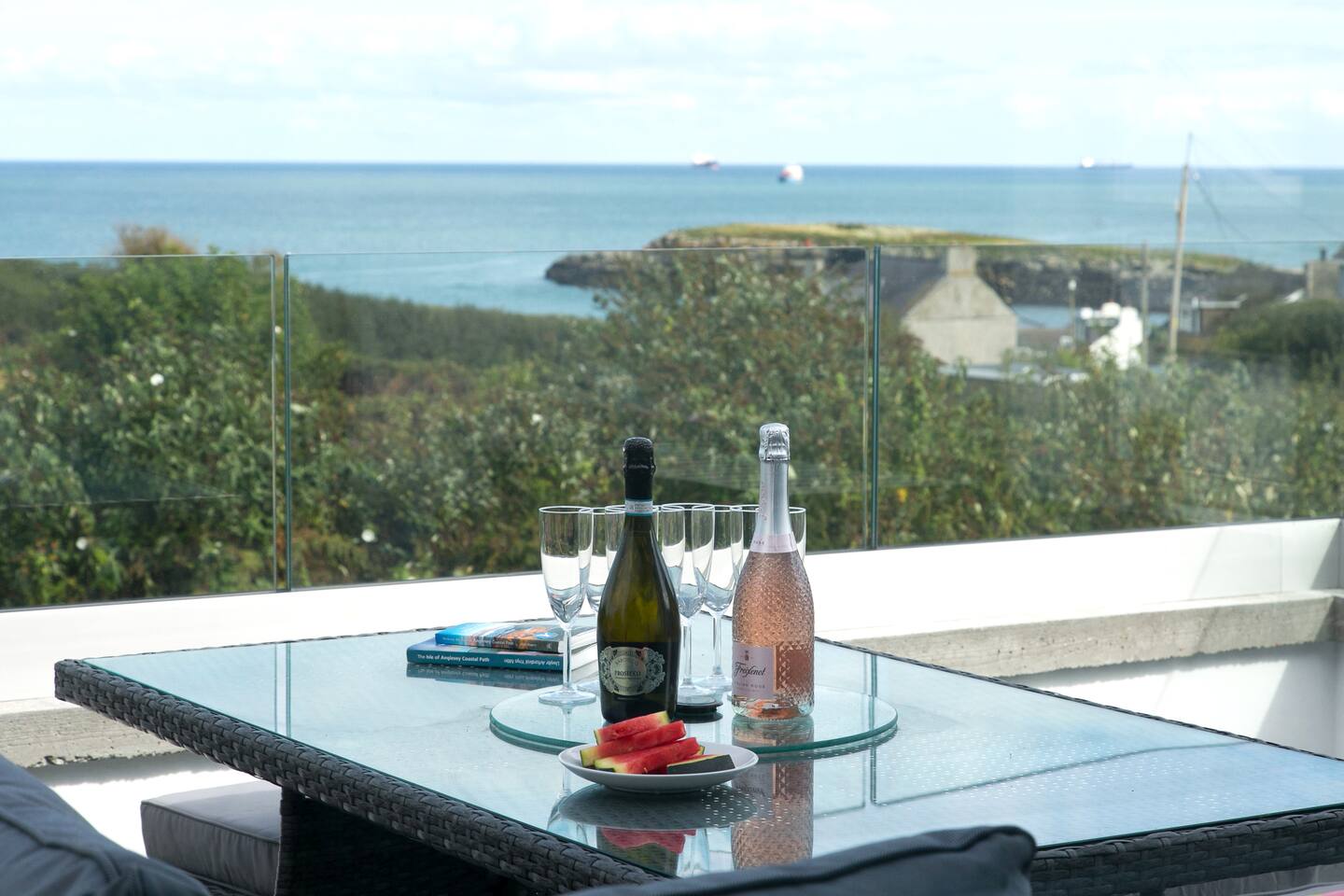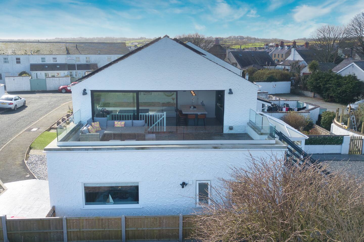 Welcome to your perfect coastal getaway. The property is designed with an upside-down living layout, meaning the main living space is upstairs — allowing you to enjoy uninterrupted views from the kitchen, dining area, and lounge. The open-plan kitchen and dining area is the heart of the home, featuring a large island that comfortably seats eight people. A striking glass wall runs the length of the space and opens directly onto the decked roof terrace, creating a seamless indoor-outdoor experience. It's the perfect place to gather with family and friends, enjoy meals together, or relax with a drink while watching the changing coastal scenery. Built with sustainability in mind, the property features an array of eco-friendly technologies. Solar panels, a state-of-the-art battery system, and energy-efficient underfloor heating ensure year-round comfort while reducing environmental impact. We know pets are part of the family, so your furry companions are welcome to stay, with bowls and waste bags provided. A secure garden makes travelling with pets simple, safe, and stress-free. For added convenience, guests can use the EV charging point free of charge (except between 4pm–7pm to reduce peak grid demand). For outdoor dining, a brick-built barbecue stand and utensils are provided. Guests are welcome to bring disposable barbecues, which can be purchased locally. Whether you're seeking a peaceful retreat or an adventure-filled escape, this home offers the perfect base for an unforgettable stay by the sea. PROPERTY LAYOUT All bedrooms and bathrooms are located on the ground floor. Bedroom One King-size bed Sea views from front and side windows Wall-mounted TV En-suite shower room Bedroom Two Single bed with pullout trundle bed Direct access to Jack & Jill games room Wall-mounted TV Bedroom Three Single bed with trundle Direct access to Jack & Jill games room Wall-mounted TV Bedroom Four King-size bed Desk and office chair — ideal workspace for remote working Family Bathroom Bathtub with overhead shower WC and washbasin The Jack & Jill games room connects Bedrooms Two and Three and features: Pool table Wall-mounted TV A great space for children, teenagers, or relaxed evenings indoors. LOCATION The property is just a short walk from Moelfre village, where you’ll find welcoming pubs, cafés, and coastal charm. Follow the coastal path north to Lligwy Beach, home to a vibrant beach café and stunning shoreline views. Nearby favourites include The Ship Inn, The Old Boathouse, and The Tavern on the Bay at Red Wharf Bay.